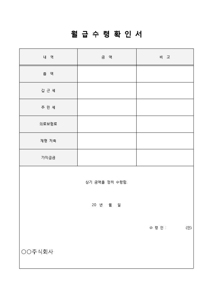 9,000원/월월급수령확인서입니다. 내역, 금액, 비고, 총액, 갑근세, 주민세, 의료보험료, 재형 저축 등으로 구성되어 있습니다. 기업으로부터 월급에 대한 수령을 확인할 때 작성하여 사용할 수 있습니다.