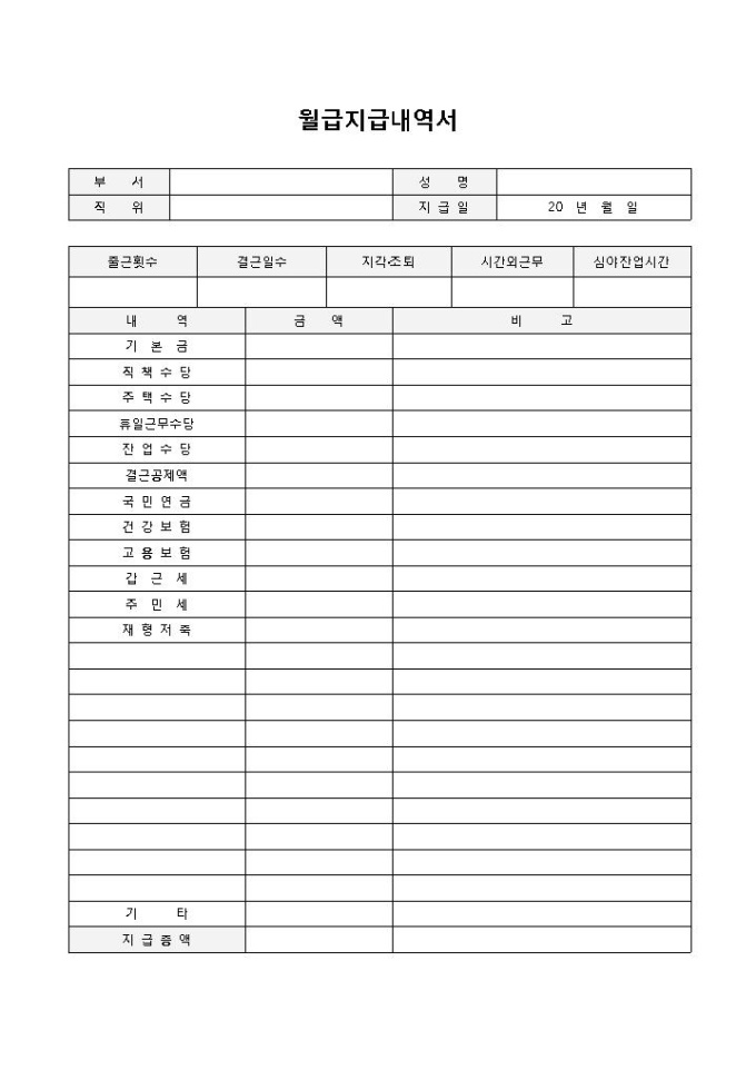 9,000원/월월급지급내역서입니다. 수급자의 인적사항, 출근횟수, 결근일수, 지각,조퇴, 시간외 근무, 심야잔업시간, 지급내역, 금액 등의 항목으로 구성되어 있습니다. 내역을 자유롭게 기술할 수 있는 양식입니다.