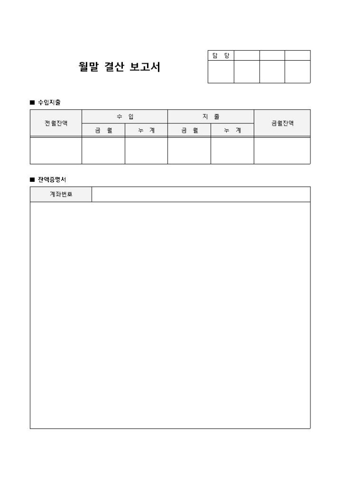 9,000원/월월말결산보고서입니다. 수입지출, 누계, 금월잔액, 잔액증명서 등의 항목으로 구성되어 있습니다.