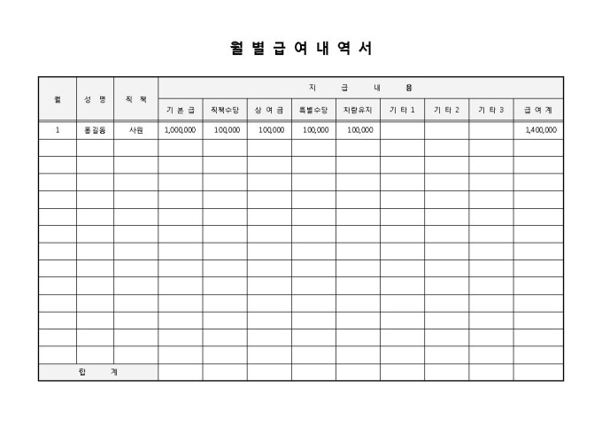 9,000원/월월별급여내역서입니다. 월, 성명, 직책, 지급내용 등으로 구성되어 있습니다. 기업에서 사원에게 월별로 급여에 대한 내역서로 작성하여 사용할 수 있습니다.