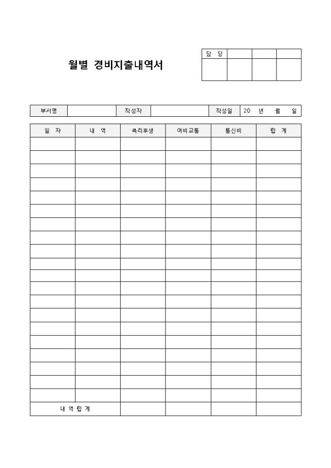 9,000원/월월별지출내역서(경비)입니다. 일자, 내역, 복리 후생, 여비교통, 통신비 등의 항목으로 구성되어 있습니다. 월별 지출내역을 관리할 수 있는 기본적인 양식입니다.
