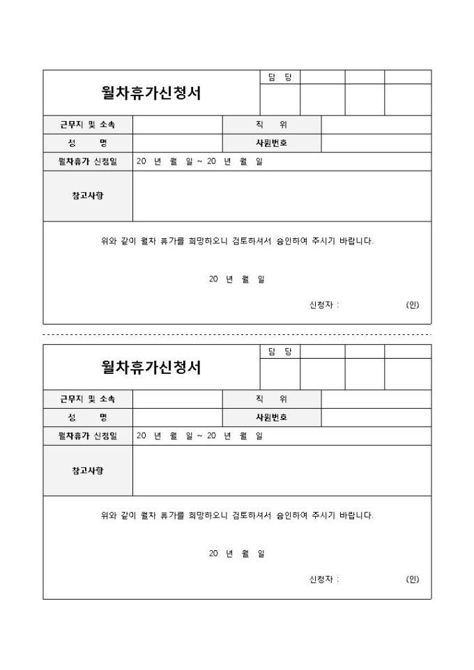 9,000원/월직장에서 월차 휴가를 희망할 때 부서에 제출하여 승인을 받을 때 사용되는 월차휴가 신청서 양식입니다. 근무지 및 소속, 직위, 성명, 사원번호, 월차휴가 신청일 등의 항목으로 구성되어 있습니다.
