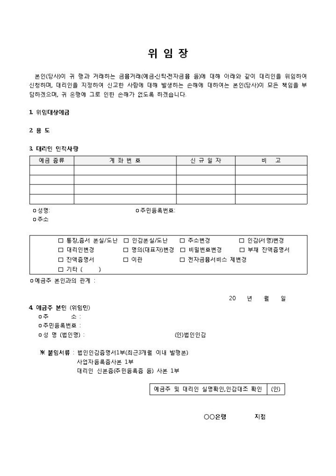 9,000원/월위임장(은행용)입니다. 위임대상예금, 용도, 대리인 인적사항, 예금주 본인 등의 항목으로 구성되어 있습니다.
