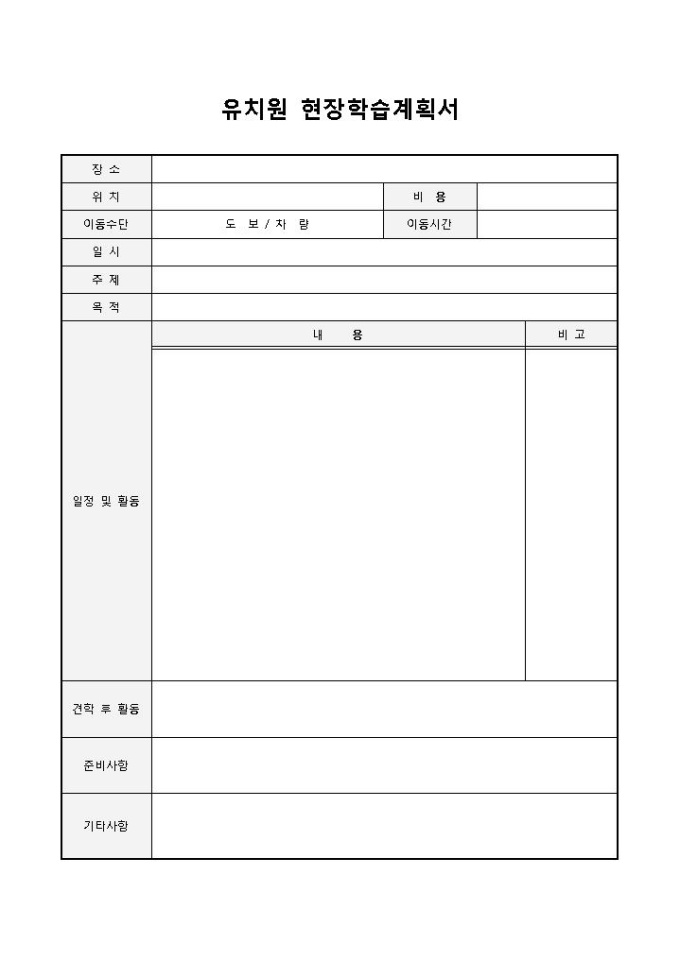 9,000원/월유치원 현장학습계획서입니다. 장소, 위치, 비용, 이동수단, 이동시간, 일시, 주제, 목적, 일정 및 활동 등으로 구성되어 있습니다. 유치원에서 현장학습을 갈 때 계획서로 작성하여 사용할 수 있습니다.