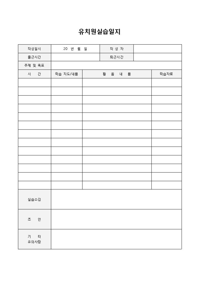 9,000원/월유치원실습일지입니다. 작성일시, 작성자, 출퇴근시간, 주제 및 목표, 시간, 학습지도내용, 활동내용, 학습자료 등의 항목으로 구성되어 있습니다. 다수의 실습내용을 간략하게 기록할 경우 사용할 수 있는 양식입니다.