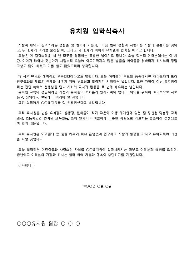 9,000원/월유치원 입학식축사입니다. 입학식 축사 내용으로 구성되어 있습니다. 유치원에 입학시키시는 학무모께 축하를 드리며, 가정과 하시는 일에 대한 기쁨과 충만을 기원할 때 축사로 작성하여 사용할 수 있습니다.