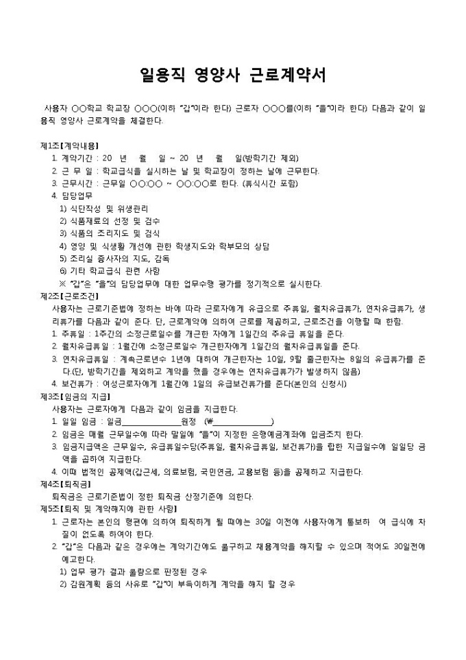 9,000원/월일용직 영양사 근로계약서입니다. 일용직 영양사 근로 계약 내용으로 구성되어 있습니다. 사용자 학교 학교장과 근로자가 상호간에 일용직 영양사에 대한 근로 계약을 체결할 때 작성하여 사용할 수 있습니다.