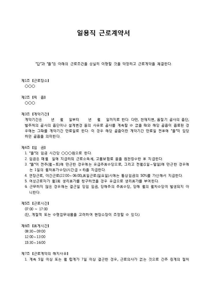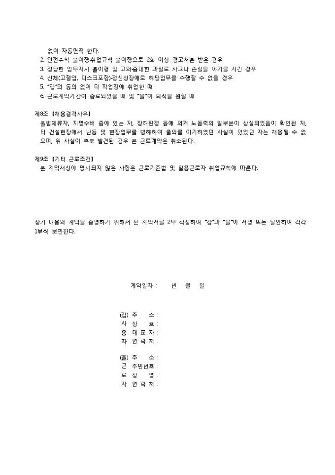 9,000원/월건설 공사현장에서 근무하는 일용직 근로자가 근로 대가를 지급받기로 약정할 때 사용되는 일용직근로계약서(건설 공사현장 근무) 양식입니다. 여러 조항, 서로 간의 인적사항의 항목으로 구성되어 있습니다.