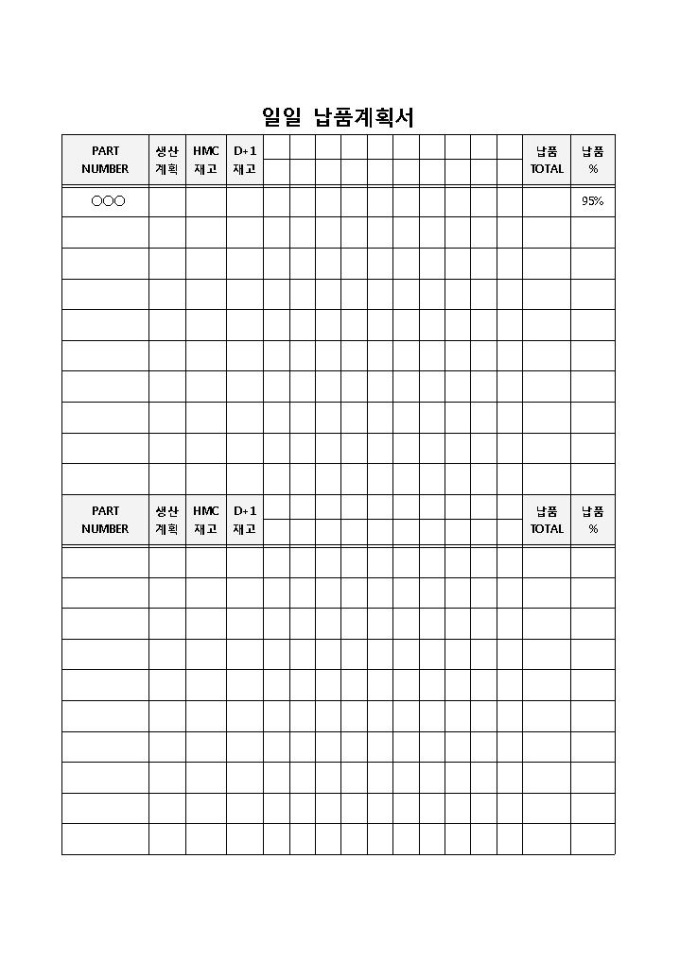9,000원/월매일 제품의 납품 계획을 보고할 때 사용되는 일일 납품계획서 양식입니다. PART NUMBER, 생산 계획, HMC 재고, D+1 재고, 납품 TOTAL, % 등의 항목으로 구성되어 있습니다.