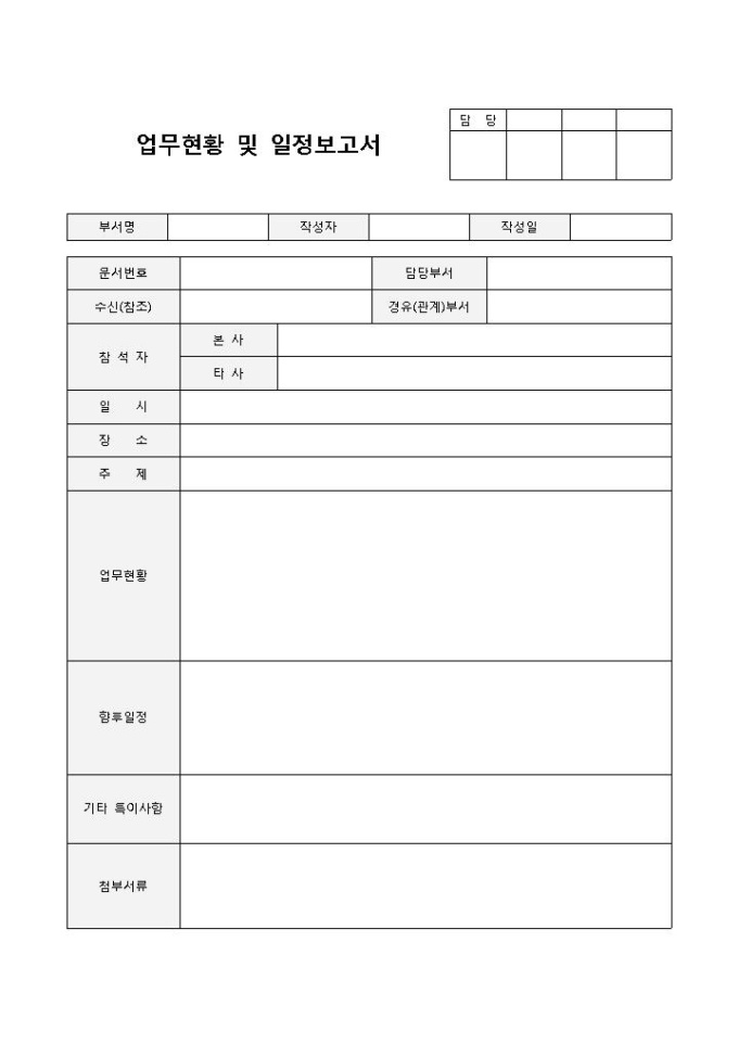 9,000원/월일정보고서(업무현황)입니다.참석자, 일시, 장소, 주제, 업무현황, 향후일정 등의 항목으로 구성되어 있습니다. 업무현황 보고와 일정 보고를 함께 할 수 있는 보고서 양식입니다.