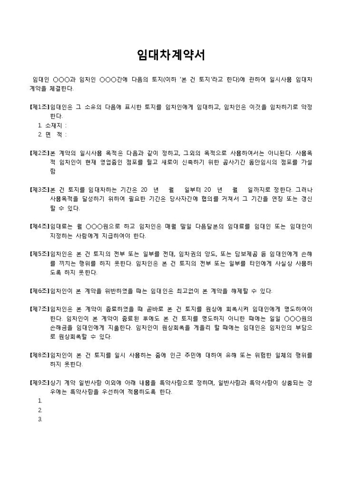 9,000원/월임대차계약서입니다. 임대차 계약 내용으로 구성되어 있습니다. 임대인과 임차인은 상호간에 토지에 관한 일시사용 임대차 계약을 체결할 때 작성하여 사용할 수 있습니다.