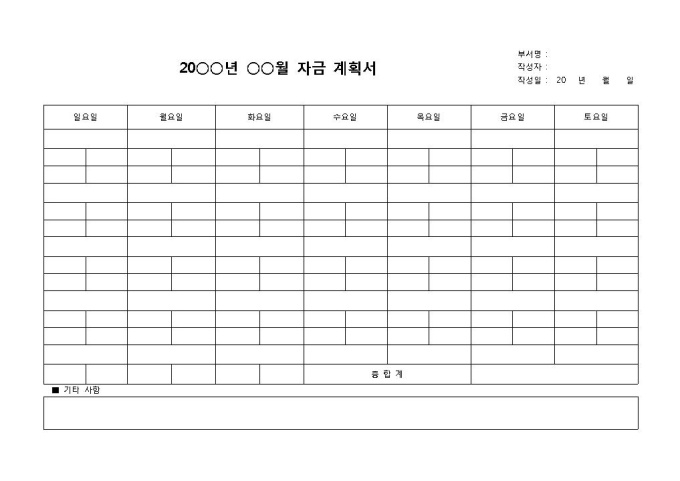 9,000원/월자금계획서(월간)입니다. 월간 자금 계획을 간략하게 작성할 수 있도록 만들어진 양식입니다.