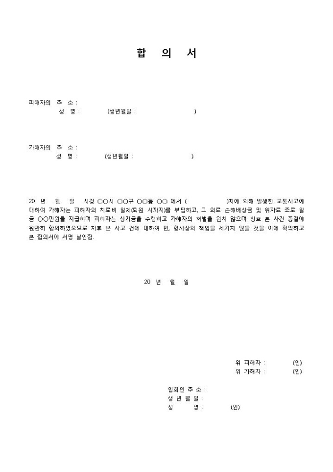 9,000원/월자동차사고합의서입니다. 피해자의 인적사항, 가해자의 인적사항 등의 항목으로 구성되어 있습니다. 사고 일자, 장소, 사고차량 정보, 합의금, 가해자의 처벌을 원치 않고 민형사상 책임을 제기치 않겠다는 내용이 문장으로 서술되어 있는 합의서 양식입니다.