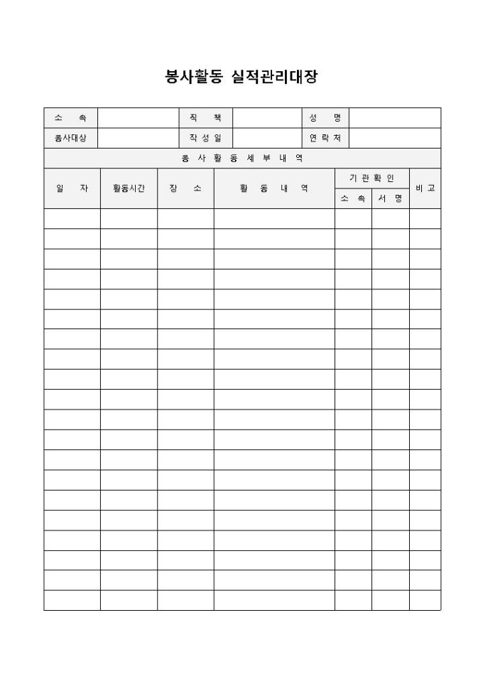 9,000원/월자원봉사관리대장(실적관리)입니다. 소속, 직책, 봉사대상, 작성일, 일자, 활동기간, 장소, 활동내역 등의 항목으로 구성되어 있습니다. 자원봉사 내역에 대해 실적관리 시 사용 가능한 양식입니다.