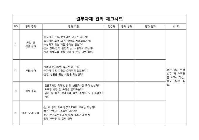 9,000원/월자재체크리스트(원부자재관리)입니다. 평가항목, 평가기준, 점검자, 평가일자 등의 항목으로 구성되어 있습니다. 원부자재 관리시 포장 및 식별상태, 보관상태, 자재 검수, 보관구역상태 등의 항목으로 나누어 관리 현황을 점검할 수 있습니다.