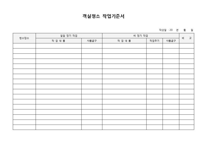 9,000원/월작업기준서(객실청소)입니다. 청소장소, 일일정기작업, 비정기작업 등의 항목으로 구성되어 있습니다. 호텔 객실청소시 사용할 수 있는 양식입니다.