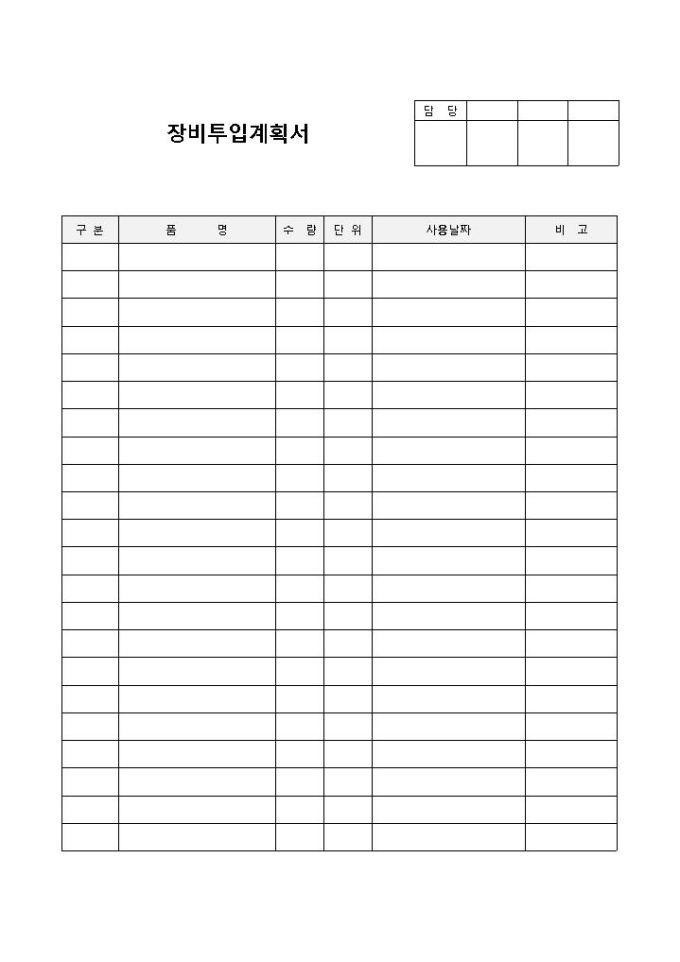 9,000원/월장비투입계획서입니다. 구분, 품명, 수량, 단위, 사용날짜 등의 항목으로 구성되어 있습니다. 장비 투입계획에 대해 대략적으로 작성할 수 있는 장비투입계획서 양식입니다.