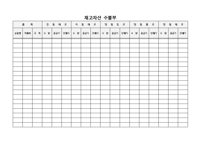 9,000원/월전월, 이월 및 당월 상품의 재고를 기록하고 관리할 때 사용되는 재고자산 수불부 양식입니다. 품목, 수량, 공급가, 판매가 등의 항목으로 구성되어 있습니다.