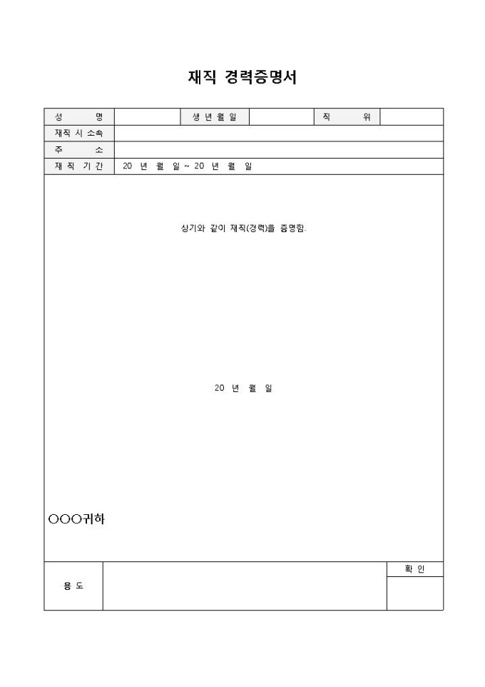 9,000원/월재직경력증명서입니다. 성명, 주민등록번호, 주소, 재직기간 등의 항목으로 구성되어 있습니다. 재직경력을 증명할 경우 간략하게 작성하여 사용 할 수 있는 양식입니다.