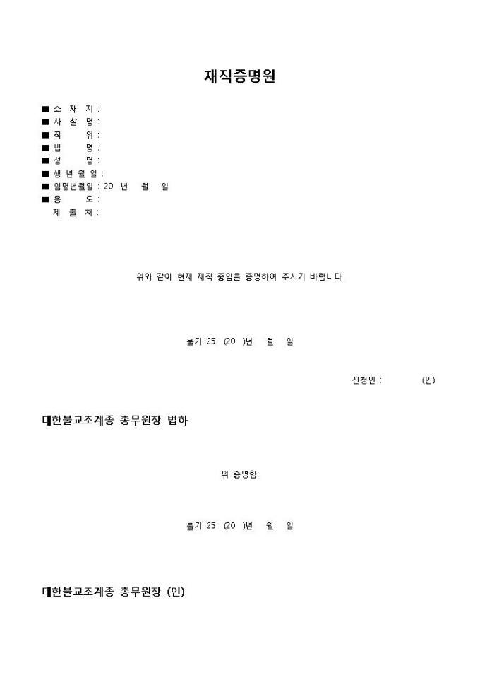 9,000원/월재직증명원(조계종)입니다. 소재지, 사찰명, 직위, 법명, 성명, 주민등록번호, 임명년월일 등의 항목으로 구성되어 있습니다. 조계종에서 재직을 증명할 경우 사용 가능한 양식입니다.