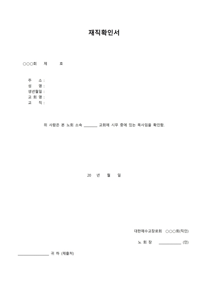 9,000원/월재직확인서(목사)입니다. 주소, 성명, 생년월일, 교회명, 교직 등의 항목으로 구성되어 있습니다. 노회에 소속된 목사임을 증명하는 간단한 확인서 양식입니다.