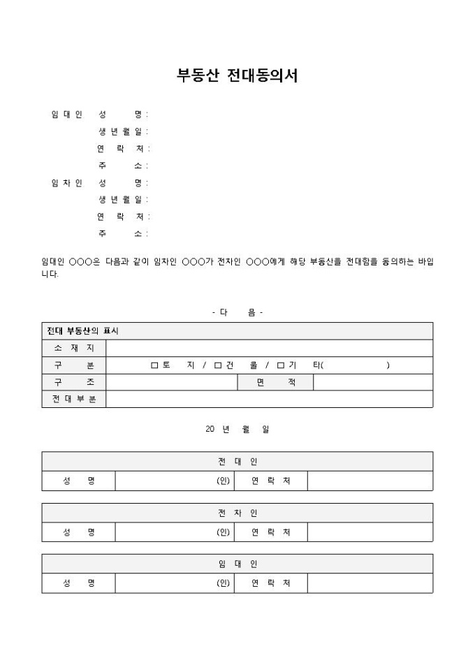9,000원/월전대동의서(부동산)입니다. 임대인의 인적사항, 임차인의 인적사항, 전대 부동산의 표시 등의 항목으로 구성되어 있습니다. 임차인이 전차인에게 해당 부동산을 전대하는 것을 임대인이 동의한다는 내용의 전대 동의서 양식입니다.