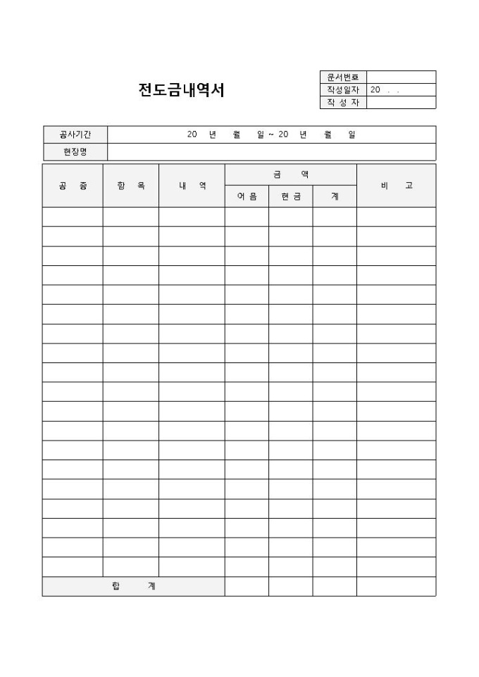 9,000원/월전도금내역서입니다. 공사기간, 현장명, 공종, 항목, 내역, 금액(어음, 현금, 계)등의 항목으로 구성되어 있습니다. 일반적인 전도금내역서 양식입니다.
