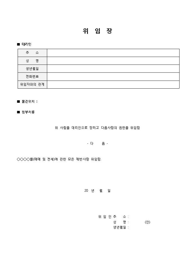 9,000원/월전세위임장(부동산매매및전세)입니다. 대리인의 인적사항, 물건위치 등의 항목으로 구성되어 있습니다. 부동산 매매와 전세에 관한 계약시 대리인에게 모든 재반사항을 위임한다는 내용의 위임장양식입니다.