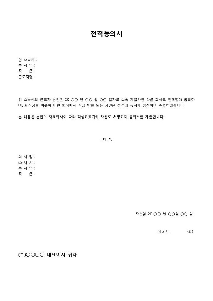 9,000원/월전적동의서입니다. 현소속사, 부서명, 직급, 근로자명 등의 항목으로 구성되어 있습니다. 근로자가 소속 계열사로 전적하면서 현 회사에서 지급 받을 금전은 전적과 동시에 정산하여 수령하겠다는 내용의 전적동의서 양식입니다.