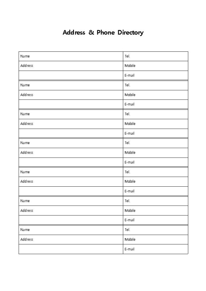 전화기록부(영문)입니다. Name, Address, Tel, Mobile, Email 등의 항목으로 구성되어 있습니다. 간단하게 전화번호부를 작성할 수 있는 영문 전화번호부 양식입니다.