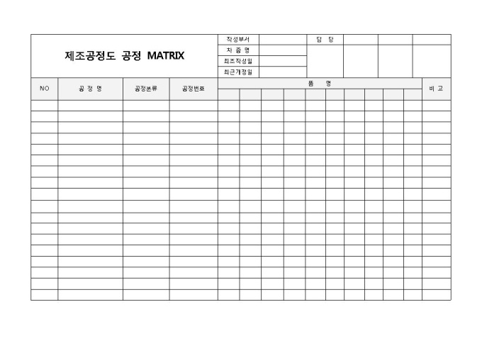 9,000원/월제조공정도(공정MATRIX)입니다. 공정명, 공정분류, 공정번호, 품명 등의 항목으로 구성되어 있습니다. 여러 종류의 품명을 자유롭게 기입할 수 있는 제조 공정도 양식입니다.