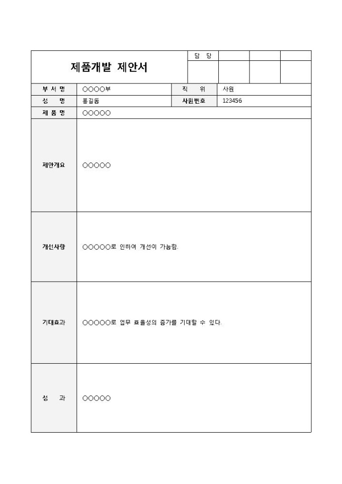 9,000원/월새로운 제품을 제작할 때 제안 받은 제품을 어떻게 수행할 지 전반적인 내용을 정리한 제품개발 제안서 양식입니다. 제안자의 부서명, 직위, 성명, 사원번호, 제품명, 제안개요, 개선사항, 기대효과 등의 항목으로 구성되어 있습니다.