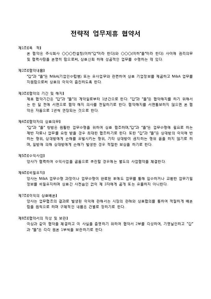 9,000원/월제휴협약서(전략적업무제휴)입니다. 총 8조항의 항목으로 구성되어 있으며, 컨설팅업체와 전략적 업무 제휴를 맺을시 사용 가능한 계약서 양식입니다.