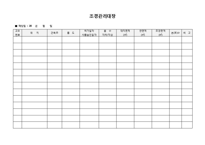 9,000원/월조경표(관리대장)입니다. 고유번호, 위치, 건축주, 용도, 허가일자, 층수, 대지면적, 연면적 등의 항목으로 구성되어 있습니다. 조경을 관리 할 경우 상세히 기록하여 관리 할 수 있는 양식입니다.