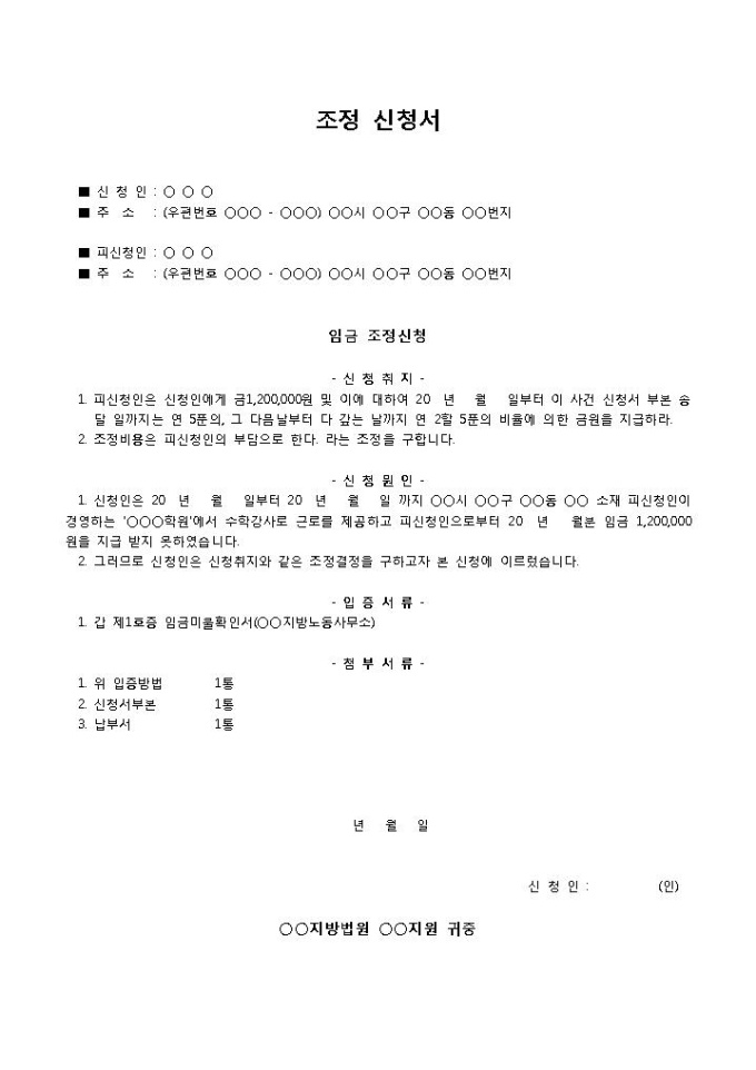 9,000원/월임금에 대한 분쟁이나 합의가 안되는 점에 대해 조정을 해줄 것을 요청할 때 사용되는 조정신청서(임금) 양식입니다. 신청인, 피신청인의 인적사항, 임금 조정신청에 대한 내용, 입증 서류, 첨부 서류 등의 항목으로 구성되어 있습니다.