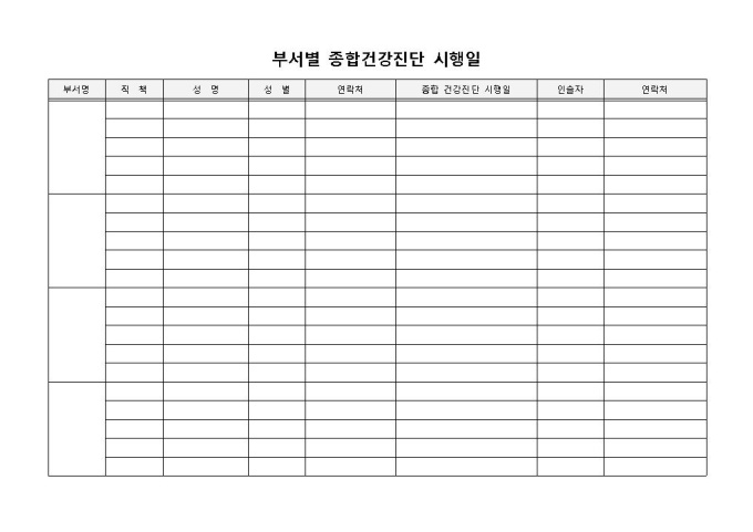 9,000원/월부서별 종합건강진단 입니다. 부서명, 직책, 성명, 성별, 연락처 등으로 구성되었습니다. 건강검진시행일을 확인하고 그에 따른 인솔자 파악에 효과적입니다.