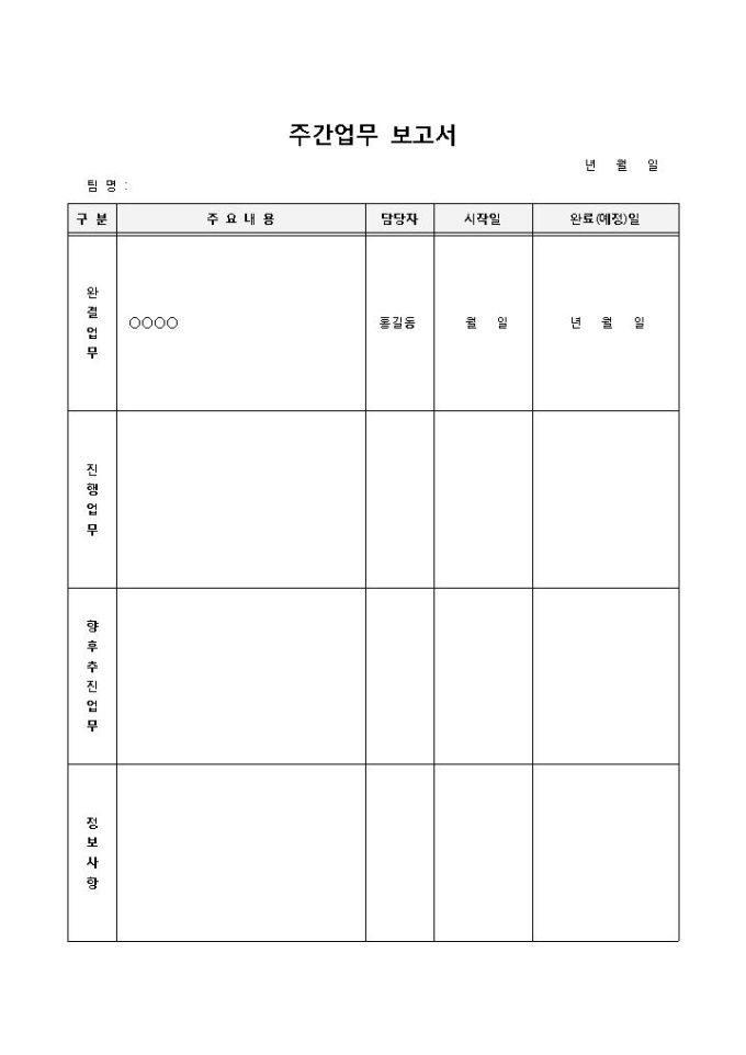 9,000원/월한 주 동안 자신이 한 업무에 대해 보고서를 제출할 때 사용되는 주간 업무보고서(업무기간 기재) 양식입니다. 팀명, 날짜, 구분, 주요내용, 담당자, 시작일, 완료(예정)일 등의 항목으로 구성되어 있습니다.