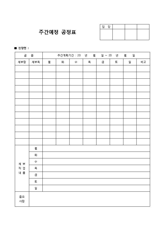 9,000원/월주간공정표(예정)입니다. 세부항, 세부목, 요일, 비고 등의 항목으로 구성되어 있습니다. 예정 공정에 대한 주별 계획을 작성할 경우 사용 할 수 있는 양식입니다.