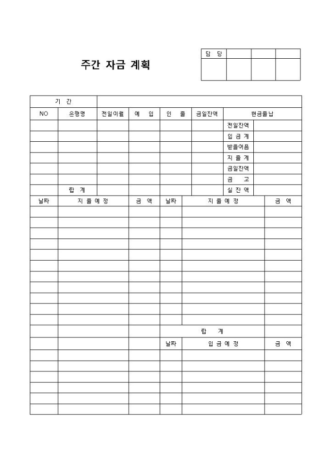 9,000원/월주간자금계획표입니다. 기간, 은행명, 전월이월, 예입, 인출 금일잔액 등의 항목으로 구성되어 있습니다. 주간 자금 계획에 대해 상세하게 기록할 수 있는 양식입니다.