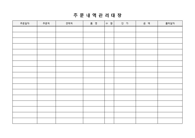 9,000원/월주문내역관리대장 입니다. 구분, 주문일자, 주문처, 연락처, 품명, 수량, 단가 등으로 구성되었습니다. 거래처별 주문사항 및 견적계산에 용이합니다.