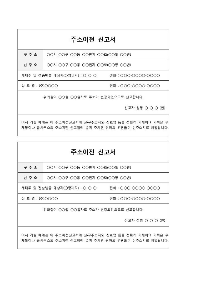 9,000원/월구 주소, 신 주소, 상호명을 기록하여 주소의 이전을 신고할 때 제출하는 주소 이전 신고서 양식입니다. 구 주소, 신 주소, 상호명, 전화, 신고자 성명 등의 항목으로 구성되어 있습니다.
