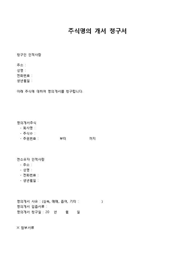 9,000원/월주식명의개서(청구서)입니다. 청구인의 인적사항, 명의개서주식의 정보, 전소유자의 인적사항 등의 항목으로 구성되어 있습니다. 주식명의 개서 청구시 간략하게 작성하여 사용할 수 있는 양식입니다.