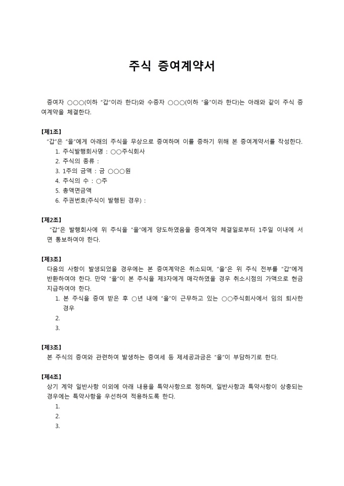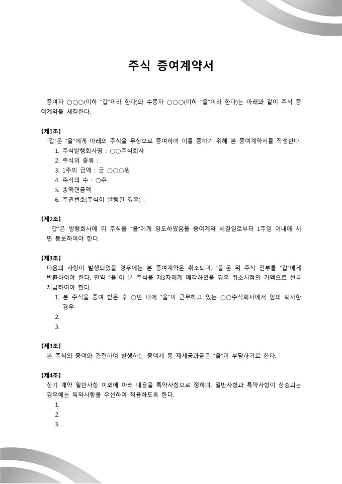 9,000원/월주식증여계약서입니다. 수증자와 증여자 간 주식 무상증여시 사용 가능한 양식입니다. 총 4개 조항으로 구성되어 있으며 제 4조항은 특약사항을 상황에 따라 기입할 수 있습니다.