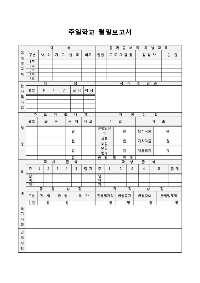 9,000원/월주일학교 월말보고서입니다. 예배, 공과공부외 특별교육, 예배 및 교육, 행사 및 사업 등으로 구성되어 있습니다. 교회에서 주일학교에 대한 월말 보고서로 작성하여 사용할 수 있습니다.