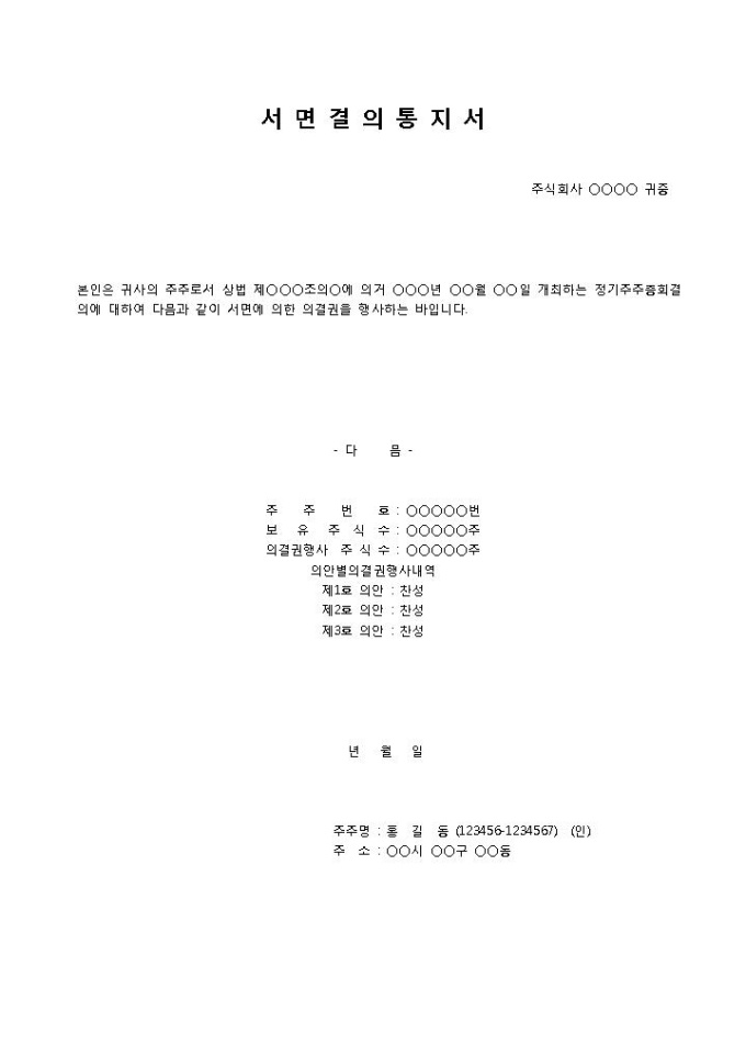 9,000원/월회사의 주주로서 정기 주주총회 결의에 대하여 서면에 의한 의결권을 행사함을 통지할 때 사용되는 주주총회 서면결의 통지서 양식입니다. 주주번호, 보유 주식수, 의결권 행사 주식수, 의안별 의결권 행사내역 등의 항목으로 구성되어 있습니다.
