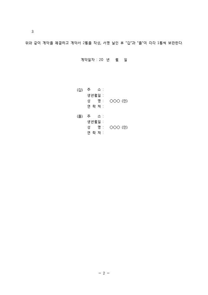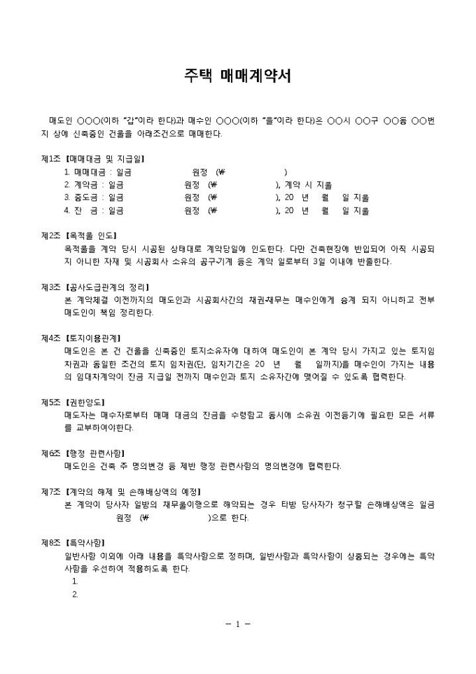 9,000원/월주택매매계약서(신규주택)입니다. 매매대금 및 지급일, 목적물 인도, 공사도급관게의 정리, 토지이용관계, 권한양도, 행정관련사항 등의 항목으로 구성되어 있습니다. 총 8개의 조항으로 구성되어 있으며 제 8조 특약사항은 임의로 작성할 수 있습니다. 신규주택 매매시 사용 할 수 있는 계약서 양식입니다.