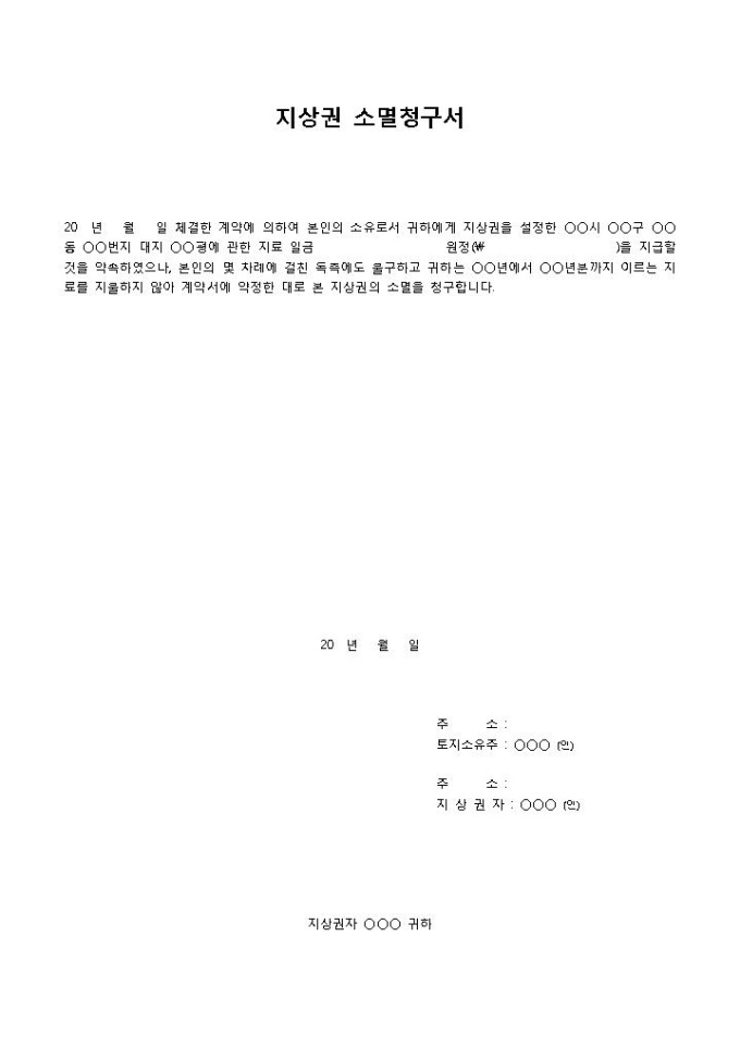 9,000원/월지상권 소멸청구서 입니다. 소유주 및 지상권자의 계약내용을 간략하게 작성할 수 입니다. 양자 간에 이루어진 계약사항 파악 및 소멸청구에 용이합니다.