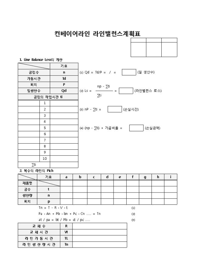 9,000원/월컨베이어라인 라인밸런스를 계획하고자 할 때 쓰이는 컨베이어라인 라인밸런스 양식입니다. Line Balance Loss의 계산, 복수의 라인의 Pich, 교체수, 교체시간, 라인가동시간, 라인생산량시간 등의 항목으로 구성되어 있습니다.
