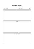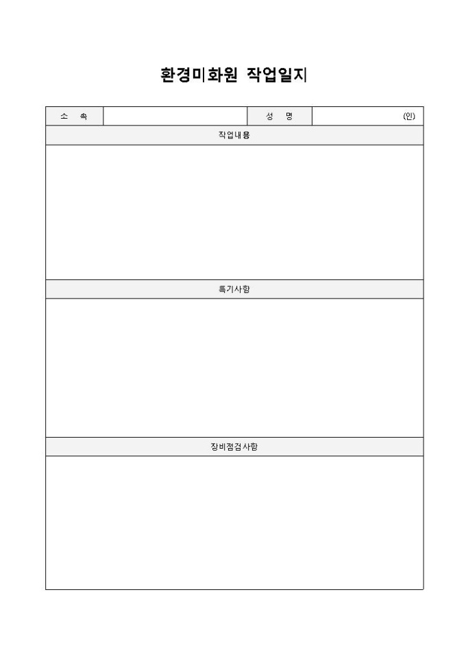 9,000원/월환경미화원 작업일지입니다. 소속, 성명, 작업내용, 특기사항, 장비점검사항 등으로 구성되어 있습니다. 환경미화원이 자신의 작업 이후에 작업에 대한 일지로 작성하여 사용할 수 있습니다.
