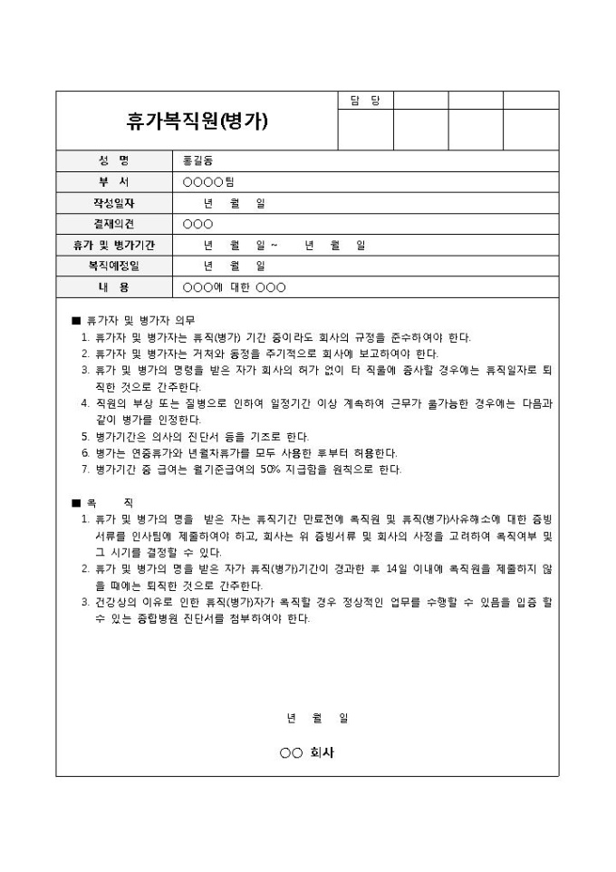 9,000원/월개인사정 및 가사사정 또는 신병치료를 위해 근무회사를 일시 휴직하였다가 다시 복직할 경우 제출하는 휴가복직원(병가) 양식입니다. 성명, 부서, 작성일자, 결재의견, 휴가 및 병가기간, 복직예정일, 내용 등의 항목으로 구성되어 있습니다.